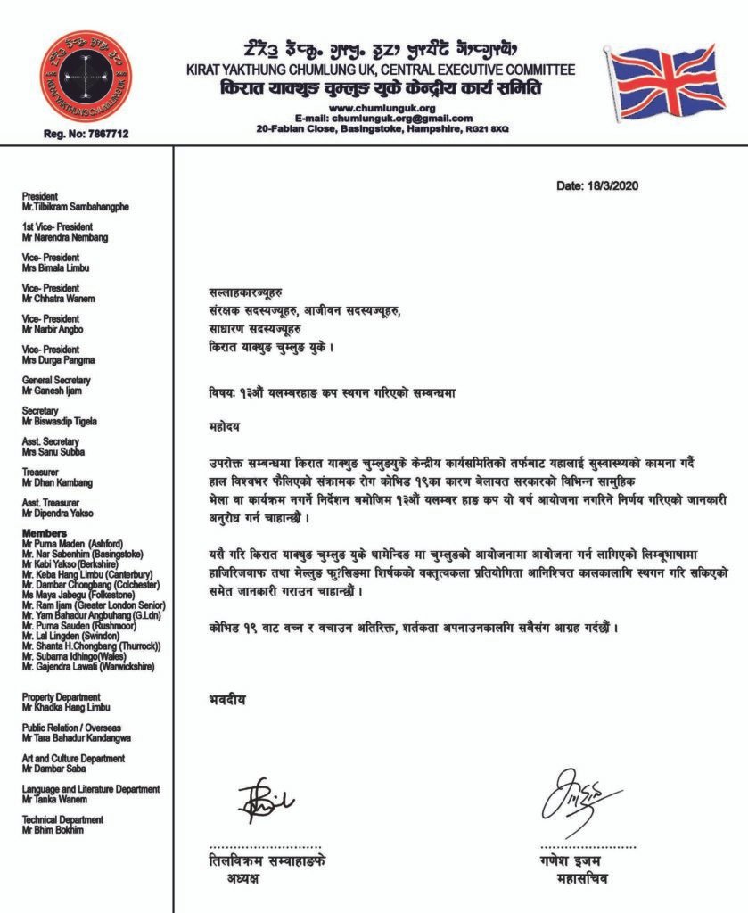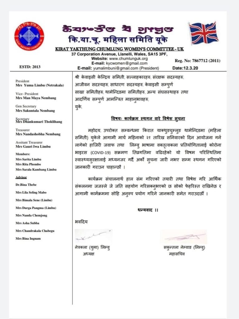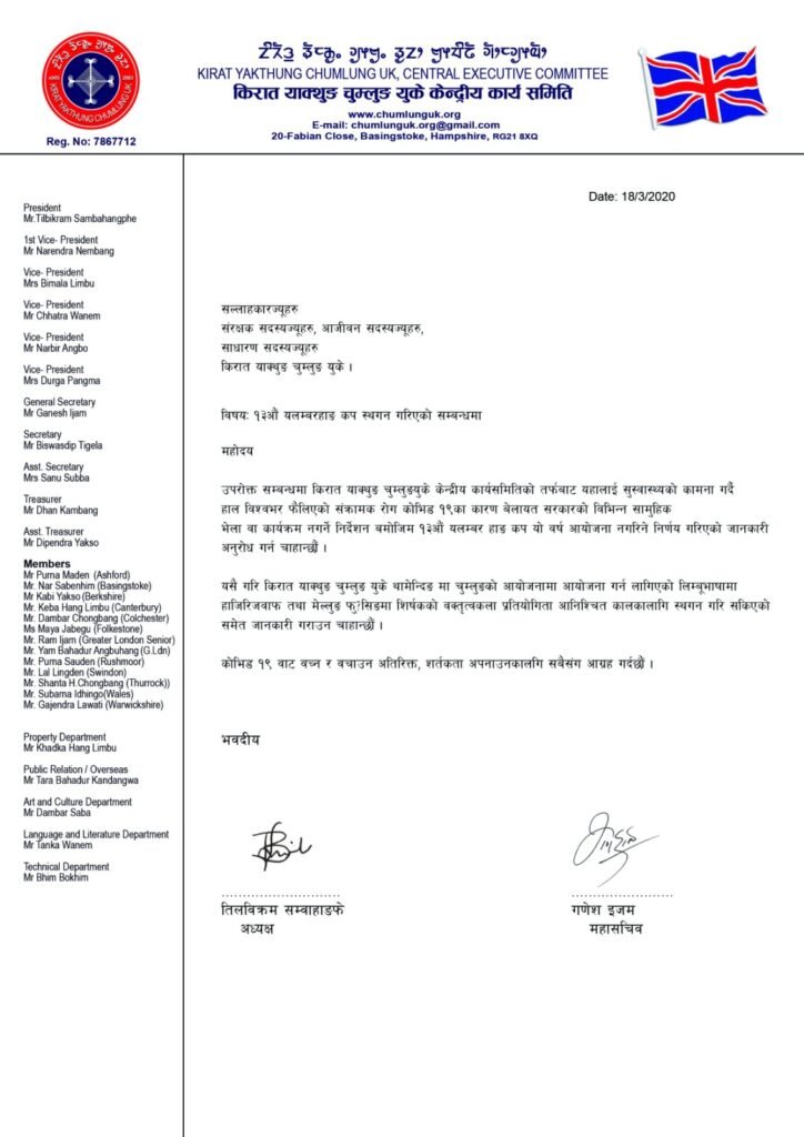 Uncategorized चुम्लुङ युकेको हाजिरी जवाफ प्रतियोगिता र यलम्बरहाँङ कप २०२०, कोरोना भाईरसको कारण रद्ध तथा स्थगन गरिएको जानकारी October 1, 2019 No Comments Views: 11 Facebook Twitter LinkedIn WhatsApp Related Posts किराती येले तङ्बे ५०८६ नयाँ वर्ष तथा कक्फेक्वा तङ्नाम (माघे संक्रान्ति राष्ट्रिय चाड – २०८२) को हार्दिक मंगलमय शुभकामना January 16, 2026 कियाचु युकेको आयोजनामा वार्षिक च्यारिटी डिनर नाइट सम्बन्धी सूचना January 7, 2026 किरात याक्थुङ चुम्लुङ यूकेद्वारा चासोक तङ्नाम २०२५ भव्य रूपमा सम्पन्न December 29, 2025 चासोक तङ्नाम २०२५ को हार्दिक शुभ कामना तथा निमन्त्रणा ! November 29, 2025 Leave a Reply Cancel replyYour email address will not be published. Required fields are marked *Comment * Name * Email * Website Save my name, email, and website in this browser for the next time I comment. Get Curated Post Updates! Sign up for my newsletter to see new photos, tips, and blog posts. Name Email Subscribe