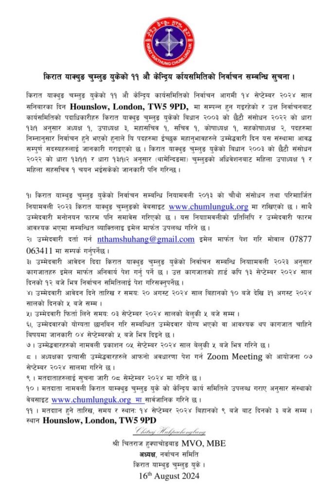 KYCUK Constitution-Sixth Amendment 2022KYCUK नियमावली 2023वेबमास्टर लाई पत्र 2024उम्मेदवारी आवेदन फारम 2024KYC UK Election Notice 2024 Date: 17 August 2024, Woking, England, UK. किरात याक्थुङ चुम्लङ यूकेको ११औं महाधिवेशनको ब्यापक्ताका साथ तीव्रता रप्तारमा >>>