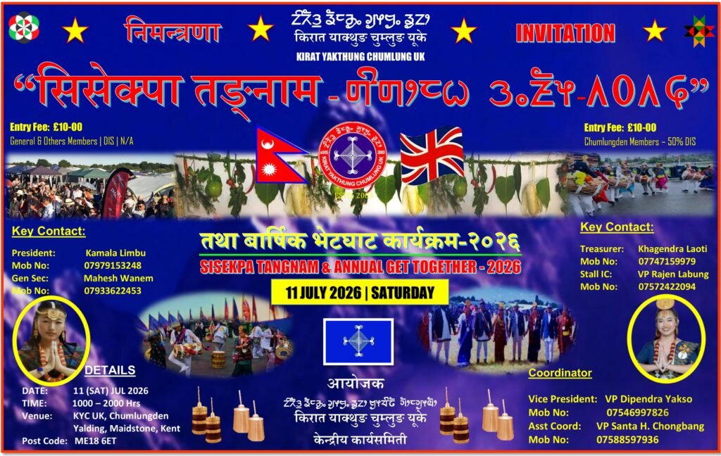 युनाइटेड किङ्डममा बसोबास गर्ने किरात याक्थुङ (लिम्बु) समुदायको साझा संस्था Kirat Yakthung Chumlung UK ले यस वर्षको सिसेक्पा तङ्नाम आगामी ११ जुलाई २०२६ मा आयोजना गर्ने भएको छ।