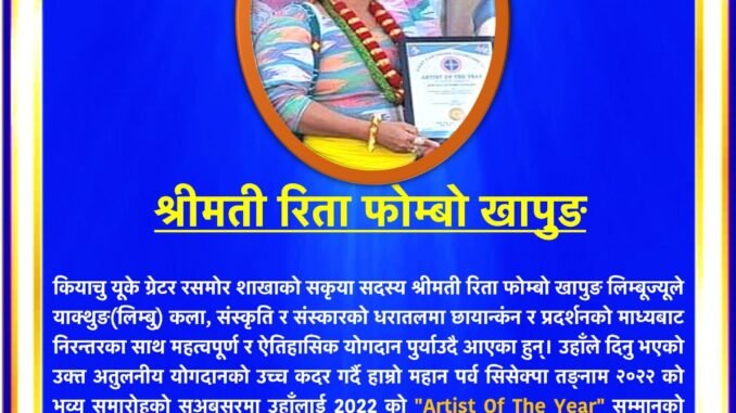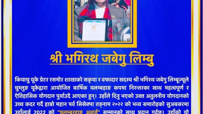 यलम्बरहाङ अवार्ड – २०२४: चुम्लुङ यूके वेस्ट केन्ट शाखाका सदस्य श्री बसन्त मादेन ज्युलाई प्रदान गरिएको छ । यलम्बरहाङ अवार्ड – २०२४: चुम्लुङ यूके वेस्ट केन्ट शाखाका सदस्य श्री बसन्त मादेन