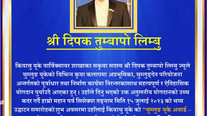 चुम्लुङ अवार्ड – २०२४: चुम्लुङ यूके वेस्ट केन्ट शाखाका सदस्य श्री जुद्द लिम्बु ज्युलाई प्रदान गरिएको छ । चुम्लुङ अवार्ड – २०२४: चुम्लुङ यूके वेस्ट केन्ट शाखाका सदस्य श्री जुद्द लिम्बु